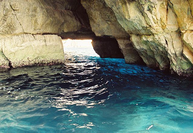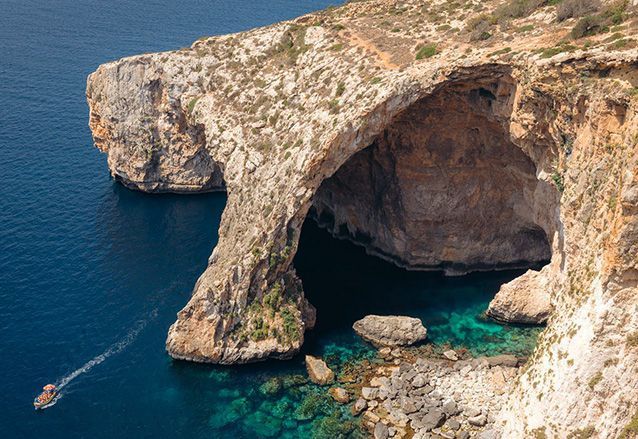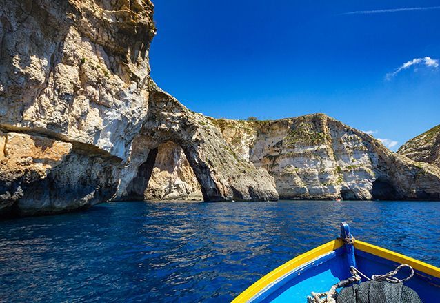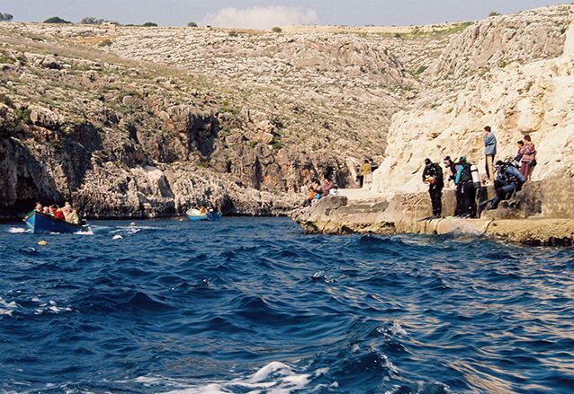 We gaan nu naar het plaatsje Wied iz-Zurrieq, gelegen aan de zuidkant van Malta. Van daaruit gaan we als het goed is met een bootje naar de blauwe grot. De bootjes varen alleen uit als de zee kalm is dus het is afwachten. Als we bij het kade aankomen kijken we een beetje bedenkelijk. Het waait vrij hard en de bootjes hobbelen behoorlijk op de golven. Van een afstandje leken de bootjes trouwens veel groter! Maar goed, we kopen stoer een kaartje en wachten onze beurt af. Na een tijdje kunnen we instappen en begint de pret. In de beschutte baai is de zee nog aardig kalm, vond ik. Totdat we de bocht omgingen..... Brrr.....Het boottochtje zou ongeveer 20 minuten duren. Voordat je bij de grotten komt vaar je eerst een stuk langs de steile indrukwekkende rotskust. De mooiste - en grootste - grot is de Blue Grotto.