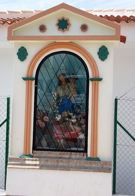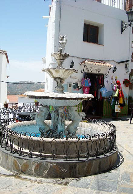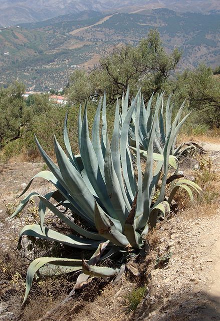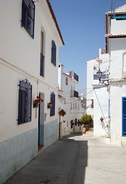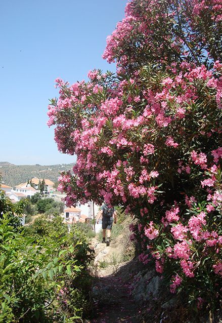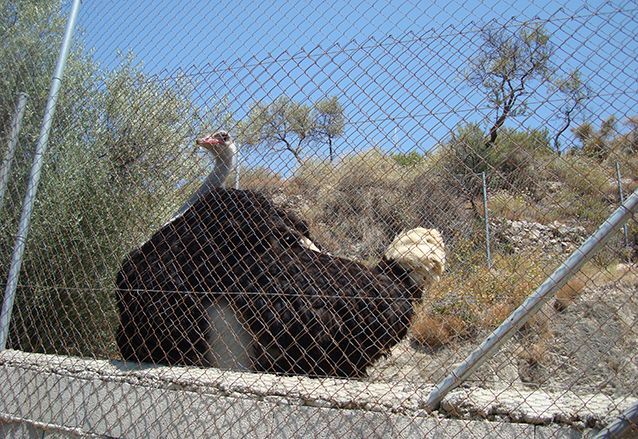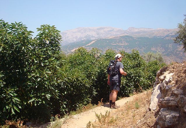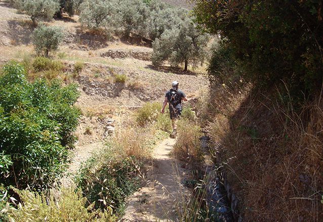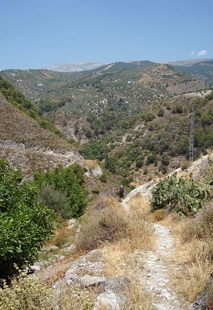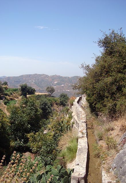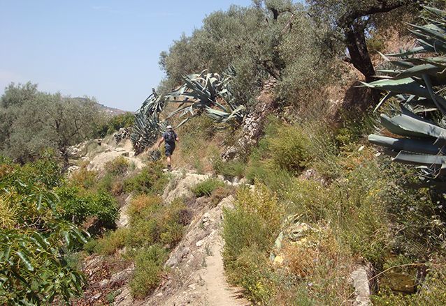 We beginnen in Cómpeta op het centrale plein, middenin het dorp. Er zitten een paar oude dorpsbewoners op een bankje, lekker te genieten in de schaduw. We worden vriendelijk begroet en de mannen wijzen ons meteen de goede weg richting de kapel voor San Anton. De weg maakt een scherpe bocht en gaat over in een voetpad, dat ons naar het volgende dorpje Canillas de Albaida zal leiden. We lopen langs een suffige struisvogel en al gauw zijn we het dorp uit. We lopen langs terrassen waarop allerlei groenten en fruit worden verbouwd. De terrassen krijgen het water via een irrigatiesysteem dat nog uit de tijd van de Moren stamt. Een netwerk van waterkanaaltjes met vertakkingen en schuiven om het water tegen te houden. Er groeien hier zelfs avocado’s! Aan de andere kant van het pad staan olijfbomen.