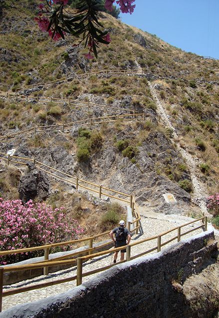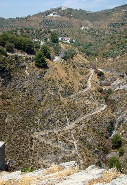 Via de weg langs de begraafplaats lopen we het dorp weer uit. We komen langs een geitenstal en dat is ook te ruiken. Als we het geitenpad afdalen zien we aan de overkant van de vallei het zigzagpad dat we straks omhoog zullen moeten. Zucht… Maar goed, eerst maar zien dat we veilig beneden komen. Als we beneden staan, lopen we over de Romeinse brug die over de rio Cájula gaat en halen we even heel diep adem: er wacht ons nog een stevige beklimming in de felle zon.