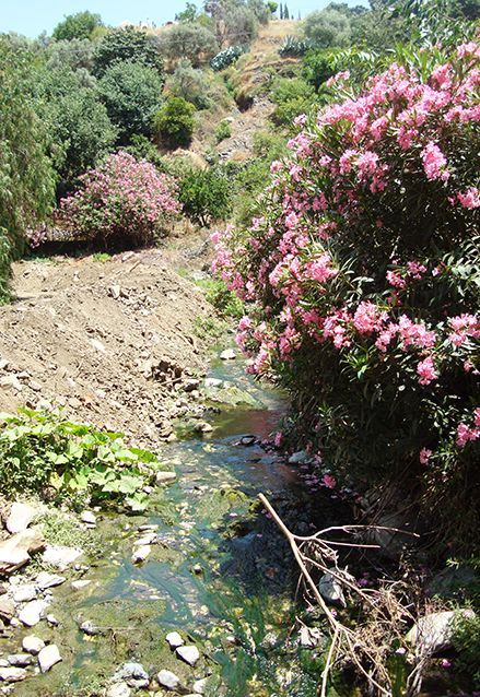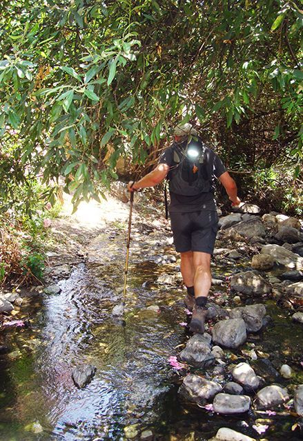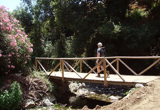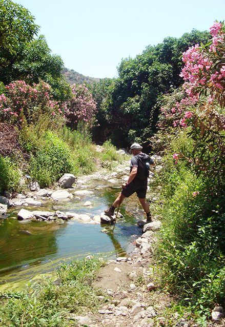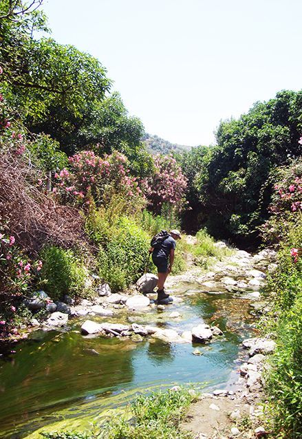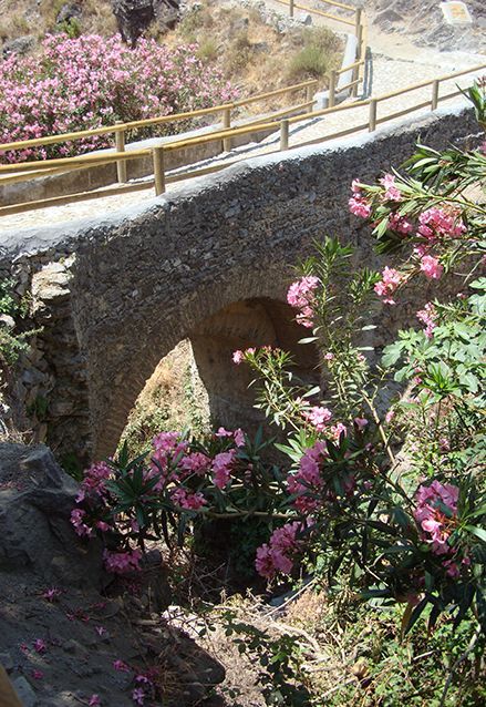 De onverharde weg houdt op en we nemen het voetpad dat naar de rivier afdaalt. We volgen het pad stroomafwaarts en moeten het riviertje een paar keer oversteken via stapstenen. Met mijn uitglijdpartij op La Palma in het achterhoofd, loop ik heel voorzichtig over de glibberige stenen die hier en daar losliggen. Gelukkig bereiken we allebei droog de overkant van het riviertje. De laatste oversteek kan via een houten brug en we lopen het dorpje Archez in.