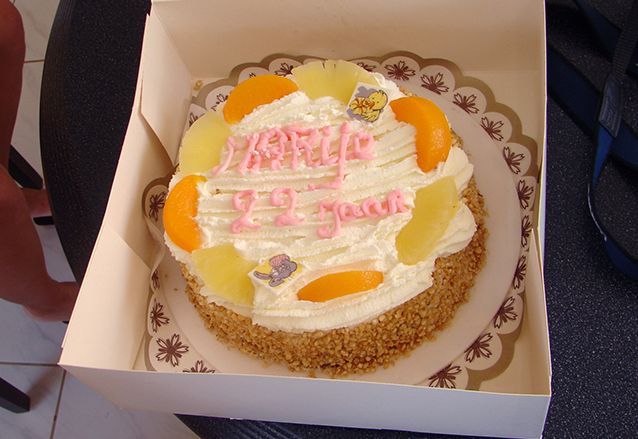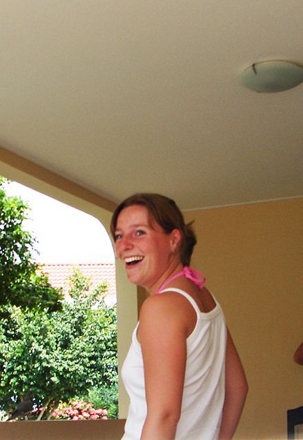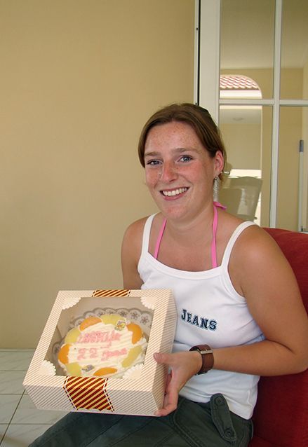 De volgende dag was Marije jarig en gingen we haar verrassen. Ze zou ’s morgens bij haar moeder in het appartement taart gaan eten. Toen ze op het terras zat begonnen wij vanuit de struiken “er is er één jarig” te zingen. Ik heb nog nooit iemand zó verbaasd zien kijken…… Geweldig, de verrassing was echt geslaagd!