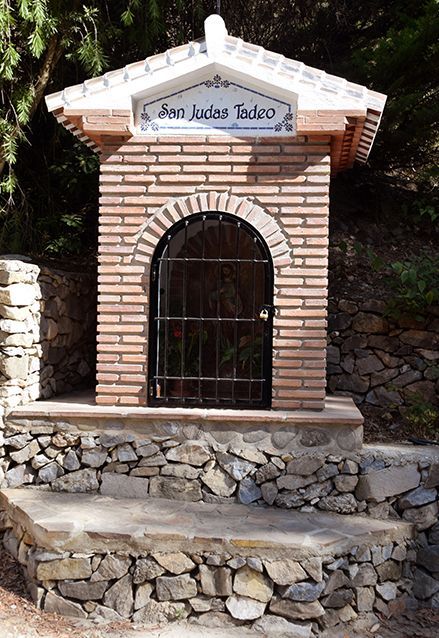 Als je eenmaal uit de bewoonde wereld bent, daalt de weg en wordt slechter. Op een gegeven moment wordt het een zandweg, maar is prima te rijden met een gewone auto. Na de zoveelste bocht krijg je al snel uitzicht op het kleine witte dorpje dat onderin het dal ligt. We stoppen vlak voordat we het dorp inrijden voor een scherpe bocht bij de droge rivier, hier staat een kapelletje San Judas Tadeo en parkeren de auto: dit is het beginpunt van onze wandeling.