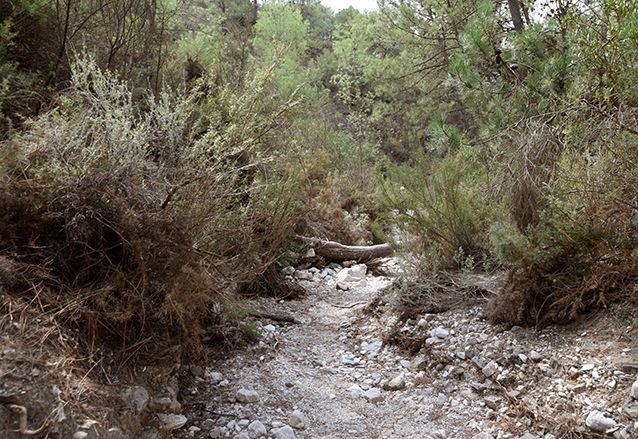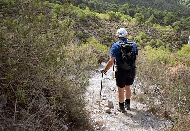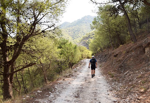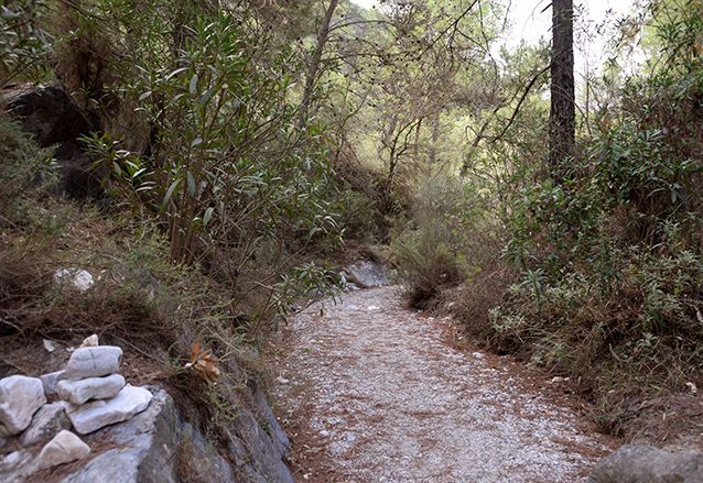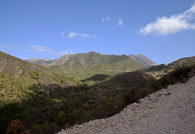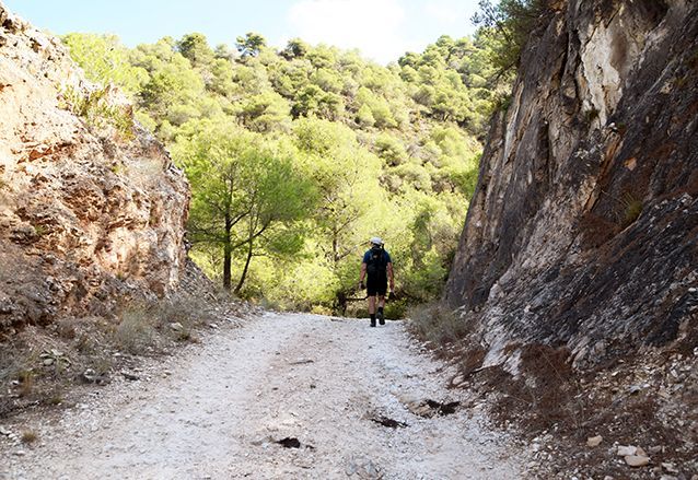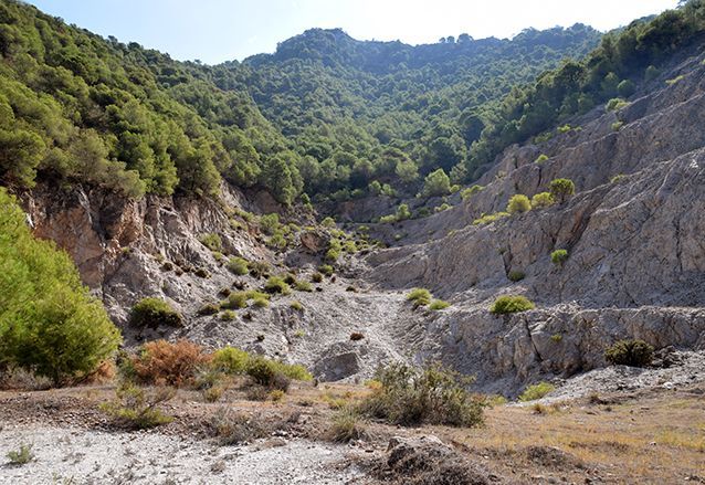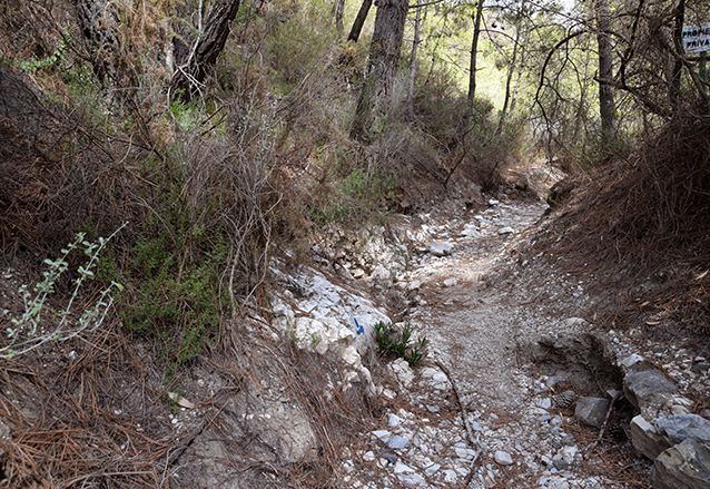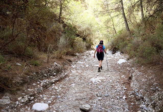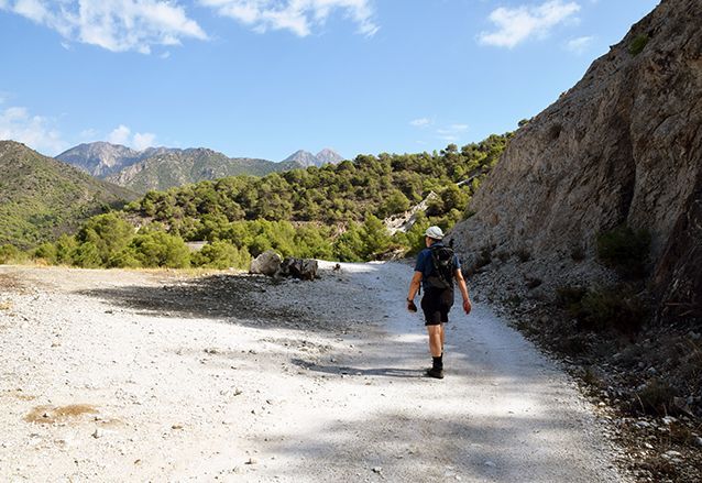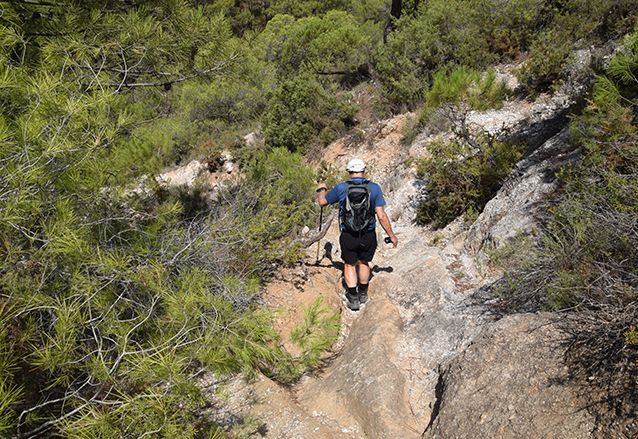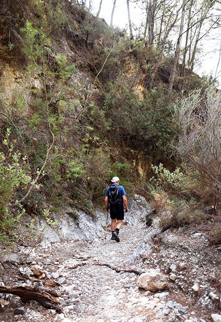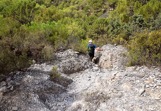 Na 3,5 kilometer merk je dat je de weg begint te dalen en we zien het rotspad waarover we moeten afdalen terug naar het dorp, bijna over het hoofd. Je volgt hier de langeafstandswandeling GR 249 en loopt door de ‘Arroyo del Acebuchal’ en hebt soms handen en voeten nodig om over de rotsen te klauteren, hier en daar is een wandelstok echt nodig. Maar dat maakt het ook juist zo leuk!
