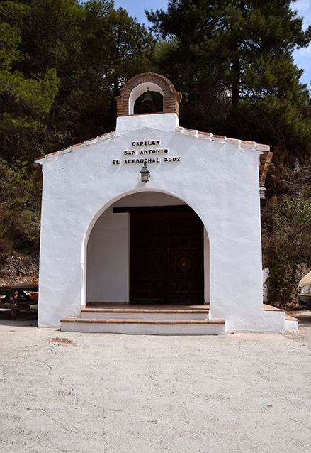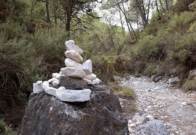 We dalen verder af en na de nodige rotsen komen we uit in de droge rivierbedding die richting het dorp loopt. We passeren een paar ‘steenmannetjes’ en na nog een paar bochten zien we de auto weer staan. Maar we willen, voordat we naar onze casa gaan, natuurlijk eerst door het opgeknapte dorpje slenteren. We lopen door tot aan de kleine kapel San Antonio die jammer genoeg dicht is en besluiten eerst maar iets te gaan drinken bij restaurant El Acebuchal. Aan het aantal auto’s op de parkeerplaats bij de kapel te zien zal het wel erg druk zijn. En inderdaad: alle tafeltjes zitten vol.