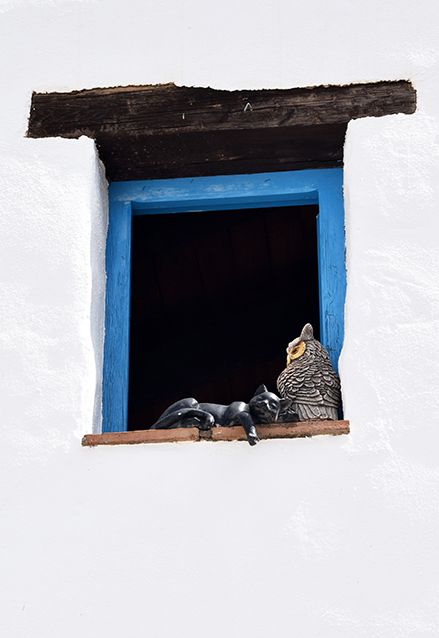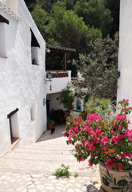 We slenteren door het gehucht, zien dat bar ‘El Acebuchal’ (met terras met mooi uitzicht) verbouwd wordt en zien dan een bordje met ‘B&B The lost village’. We lopen het straatje in en komen in een schattig smal straatje terecht, met prachtig opgeknapte huisjes die allemaal witgekalkt zijn en voorzien van kozijnen in allerlei kleuren. Er hangen overal mooie bloempotten aan de muur met bloeiende planten.