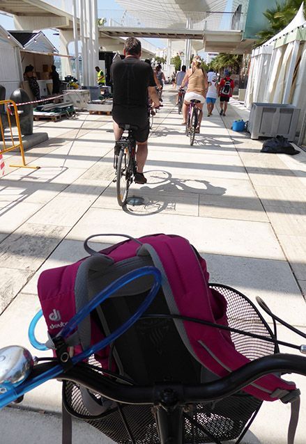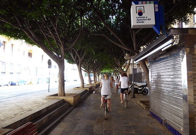 We gingen vanuit Torre del Mar lekker makkelijk met de bus naar Malaga: deze stopt in de haven vlakbij het fietsverhuurbedrijf dat de fietstochten verzorgt. Na een kopje koffie hebben we ons om kwart voor 10 gemeld waar we enthousiast werden begroet en we een fiets mochten uitzoeken. Het zadel werd op de juiste hoogte afgesteld en de gids, Laura, stelde zich aan ons voor. Om 10 uur vertrokken we met 12 man en de gids het stadscentrum in.