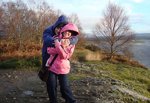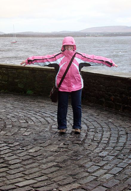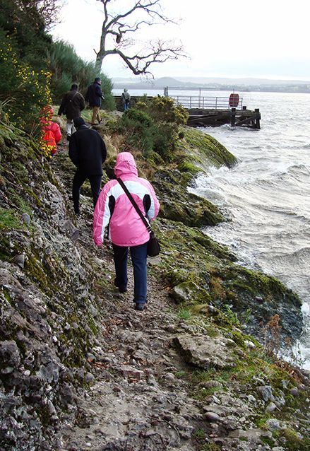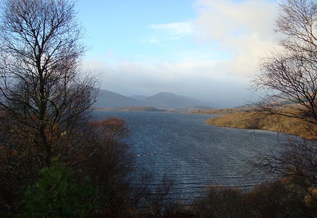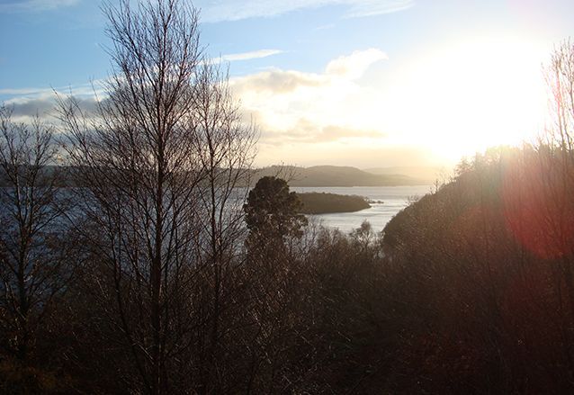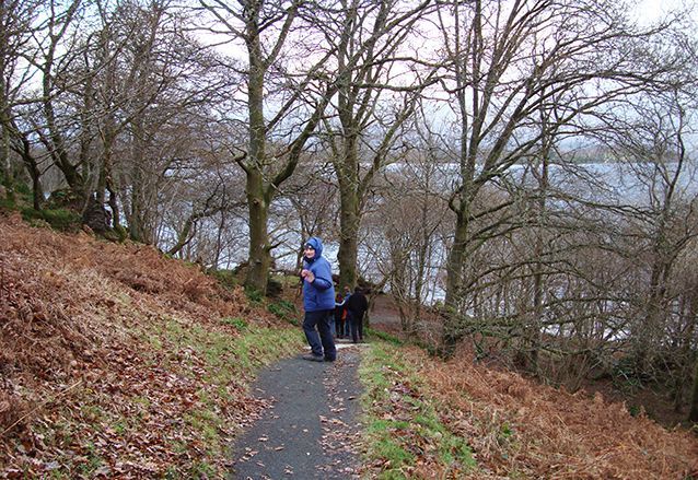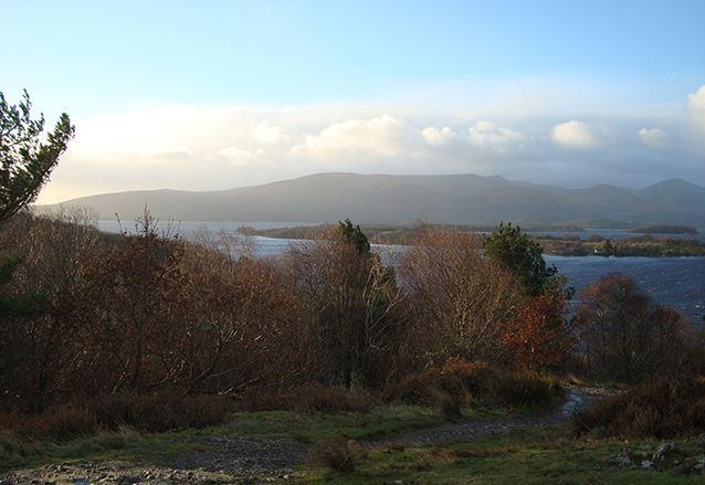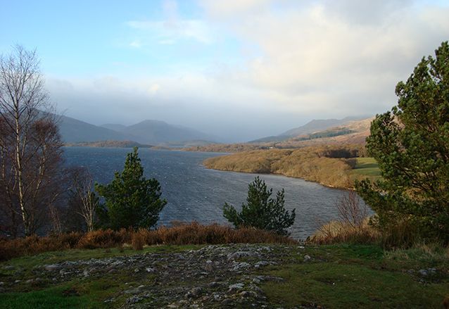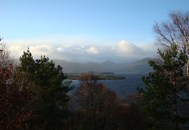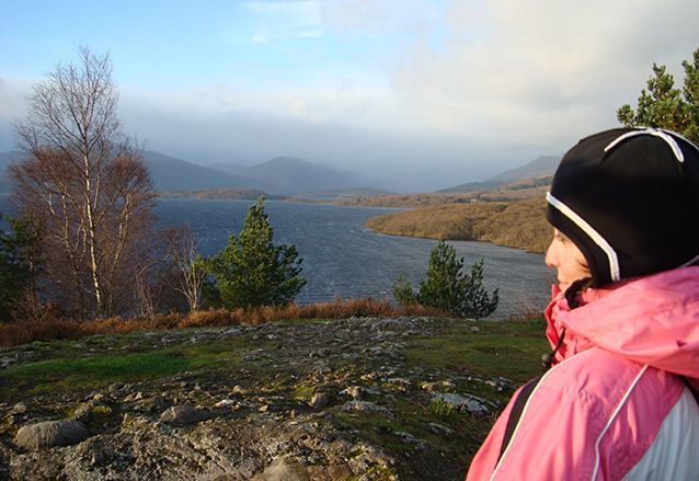 We gaan een klein stukje van de West Highland Way lopen, langs de oevers van het meer. Het is droog, maar er staat een stevige ijskoude wind. De mutsen gaan op, handschoenen aan en we volgen de gids. We moeten flink klimmen en valt niet mee, tegen de wind in. Als we boven zijn, bij het uitkijkpunt over het meer, breekt de zon voorzichtig door. Wat een geweldige omgeving! De een na de ander komt hijgend boven en geniet van het uitzicht.