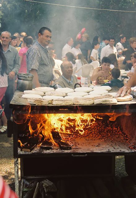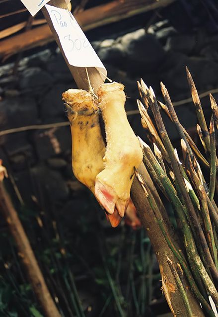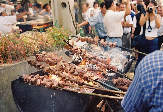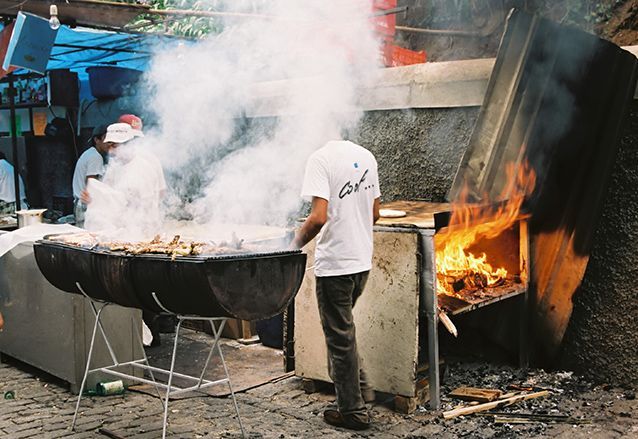 Overal staan eettentjes. Het dampt in het hele dorp en het ruikt er heerlijk.