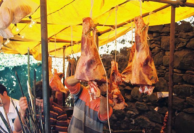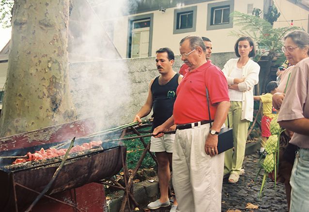 Espetada is een soort biefstuk wat aan een laurierstok wordt gedaan. Je moet wel zelf een plaatsje zoeken om het vlees te roosteren, gewoon tussen de Madeirenzers.