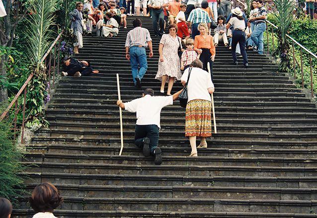 Sommige gelovigen lopen op blote voeten als een soort boetedoening. En dat valt niet mee op de kleine scherpe keitjes! We hebben zelfs mensen gezien die op hun knieën de 74 treden, van de trap die naar de kerk leidt, opklimmen.