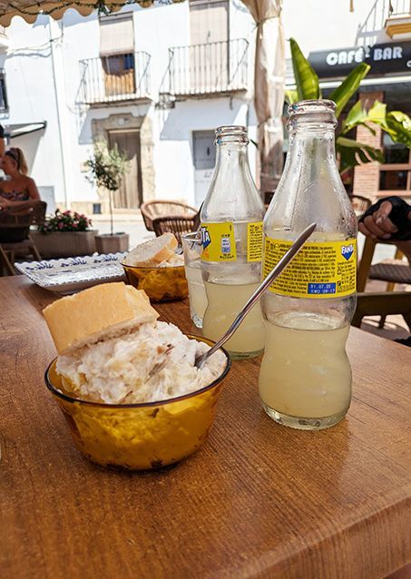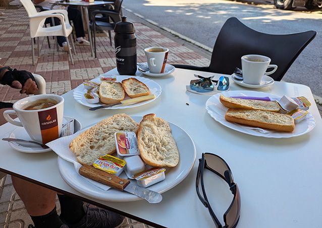 De 1e stop was in Ventas de Zafarraya: lekker een bak sterke koffie met een tostada con mantequilla y mermelade voor de snelle suikers. Daarna konden we de bidon bijvullen en gingen we weer op pad.