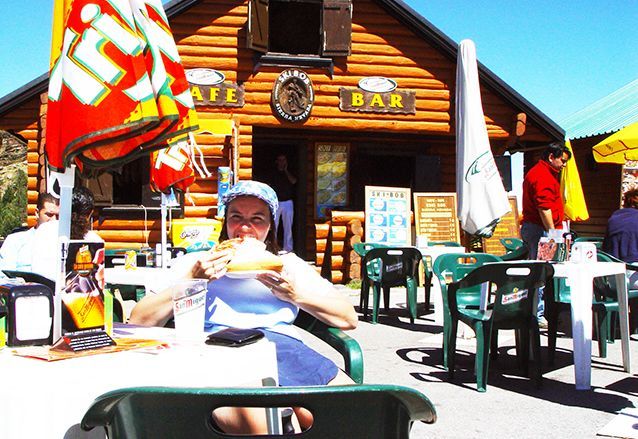 We rijden een stuk verder, om nog dichter bij de Veleta te komen. Hier vind je allerlei cafeetjes en après-ski hutten, heel apart. Als souvenirs verkopen ze sleetjes, handschoenen en nog meer wintersportachtige dingen…. Het is hier op deze hoogte wel iets kouder dan beneden in het dal, maar sneeuw? Volgens de vele foto’s die er hangen, ligt er toch echt wel eens sneeuw. Vanaf hier kun je vrij makkelijk naar de Veleta lopen, te voet of te paard. Het lijkt ook zó dichtbij…. We besluiten om richting het Mariabeeld te lopen, want naar de Veleta kost je uren: je moet dan 800 meter klimmen.
