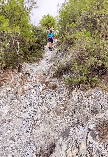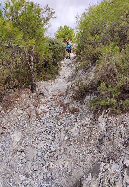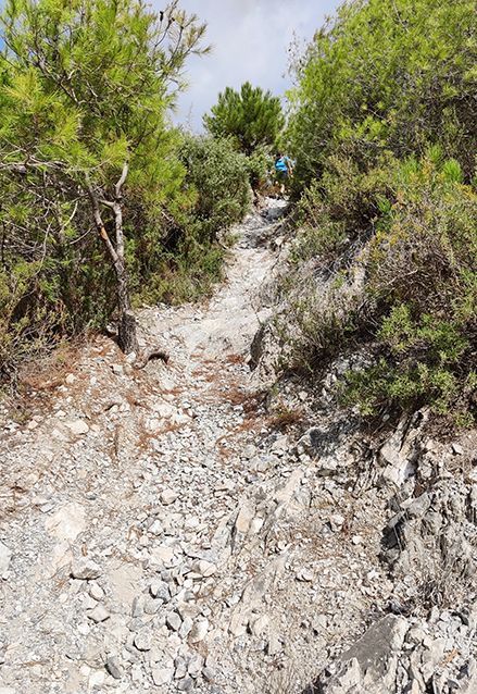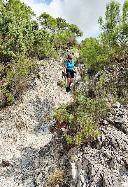 Na 3,5 kilometer merk je dat je de weg begint te dalen en we zien het rotspad waarover we moeten afdalen terug naar het dorp, bijna over het hoofd. Je volgt hier de langeafstandswandeling GR 249 en loopt door de ‘Arroyo del Acebuchal’ en hebt soms handen en voeten nodig om over de rotsen te klauteren, hier en daar is een wandelstok echt nodig. Maar dat maakt het ook juist zo leuk!