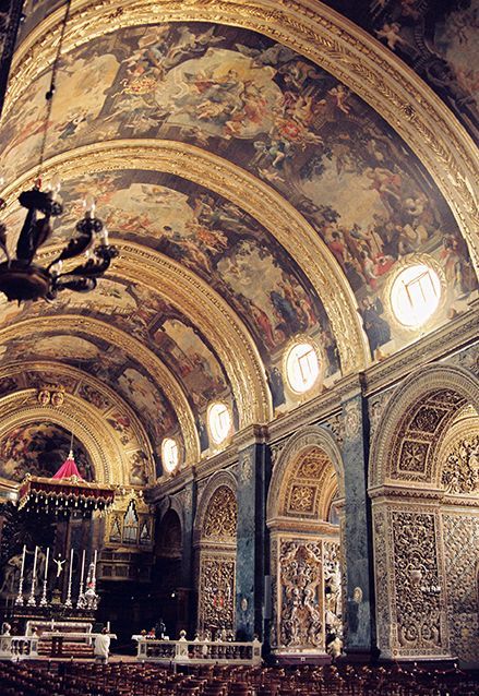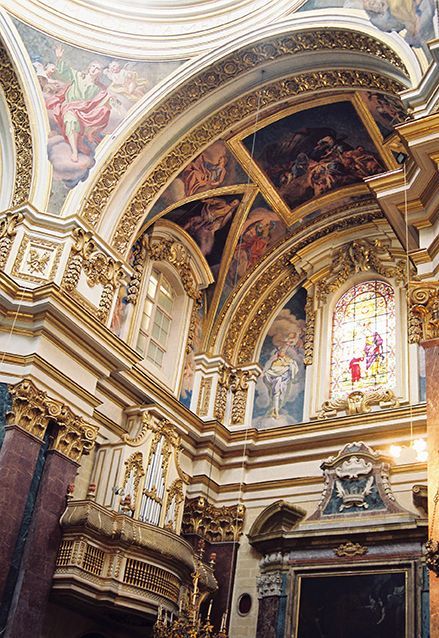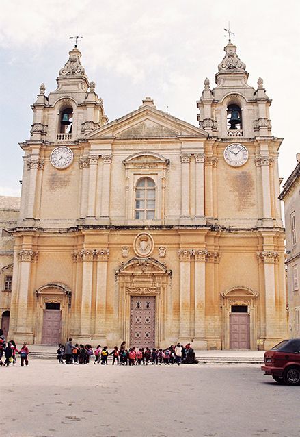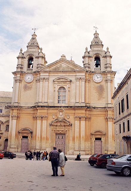 We lopen naar de Petrus en Paulus-kathedraal, gebouwd tussen 1697 en 1702. Over het inrichten van de kerk (schilderen e.d.) heeft men bijna 250 jaar gedaan. Ook hier loop je weer over de graven. Alleen zijn dit geen graven van ridders zoals in Valletta, maar graven van bisschoppen.