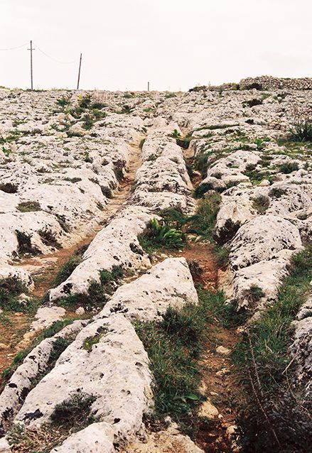 De bus brengt ons naar Buskett Gardens. Hier liggen de zogenaamde ‘karresporen’ uit de Bronstijd. De Engelsen noemen het Clapham Junction, naar een van de grote spoorwegknooppunten bij Londen. De spoorbanen bestaan uit steeds twee groeven van 5 tot 8 cm breed, die soms 75 cm diep kunnen zijn en tussen de 130 en 150 cm uit elkaar liggen. De sporen lopen parallel aan elkaar en hier en daar vind je wissels. Heel vreemd…